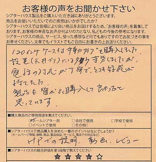 検討をしていてホームページの情報量と質問した時の迅速な対応からシアターハウスさんの商品に決めました。