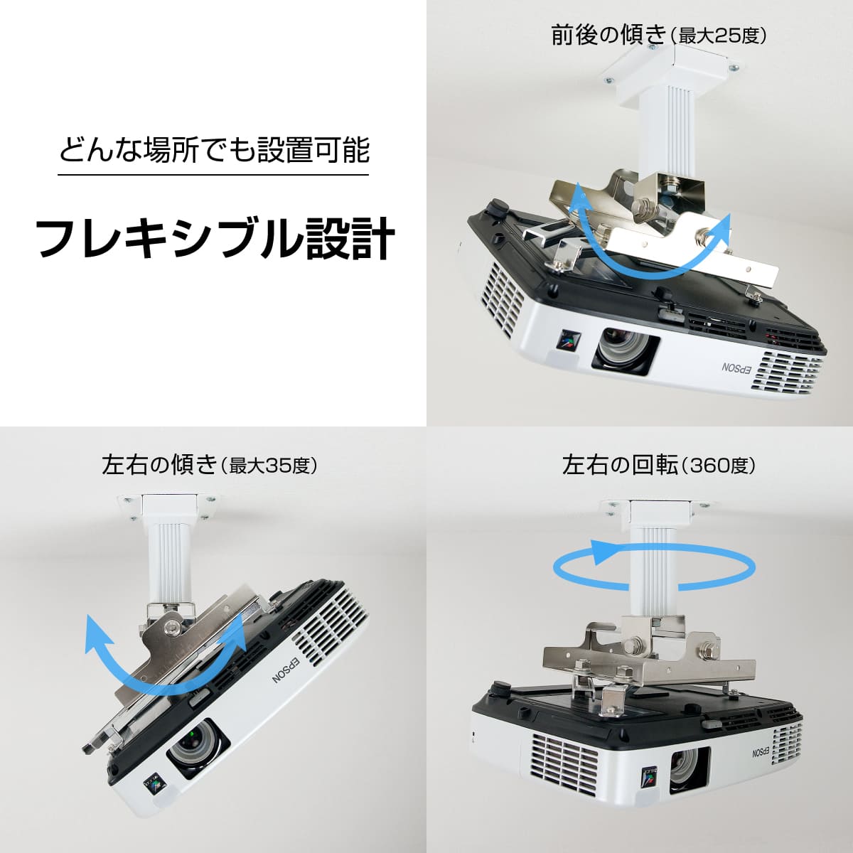汎用性が高くプロジェクターを買い替えた後でもそのまま使用することが出来ます。 メーカー純正天吊り金具に比べ価格は半額以下で製品は生涯保証です。付属シャフトの組み換えで3種類の取り付け高さ及び壁付け設置にも対応しています。