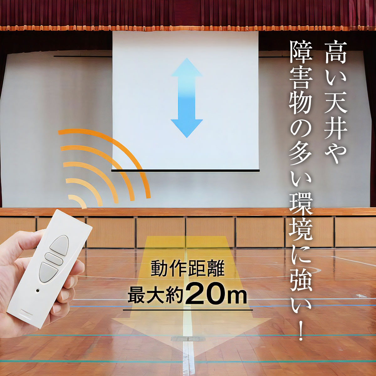 スクリーンが隠れている、遠く離れた場所からでも確実に操作できるようにRF(電波)方式を採用。天井の高い場所や障害物の多い環境でも操作が可能です。リモコン動作距離は約20mとなっています。