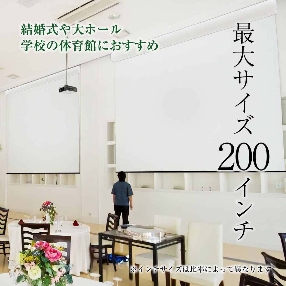 • 上部延長(上部の黒い部分が長いタイプ) 80inch 遠距離操作ケース付き電動スクリーン